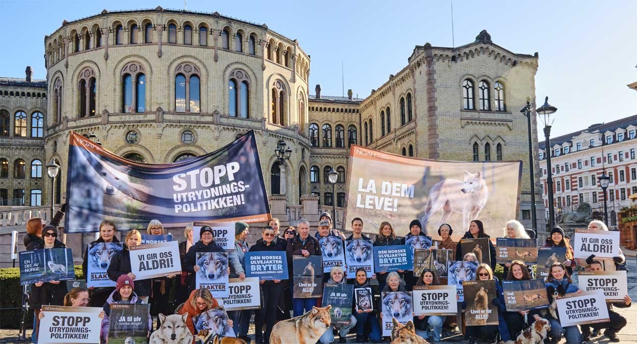 NOAH samlet tirsdag ettermiddag mange støttespillere foran Stortinget for å markere motstand mot regjeringens rovdyrpolitikk og overlevere 43.320 underskrifter for å stanse ulvejakten. Aksjonen fant sted 3. mars, på FNs internasjonale dag for ville dyr.